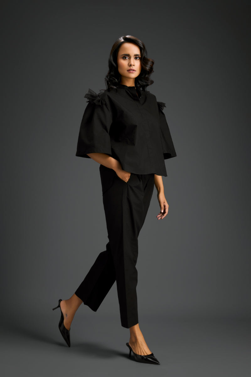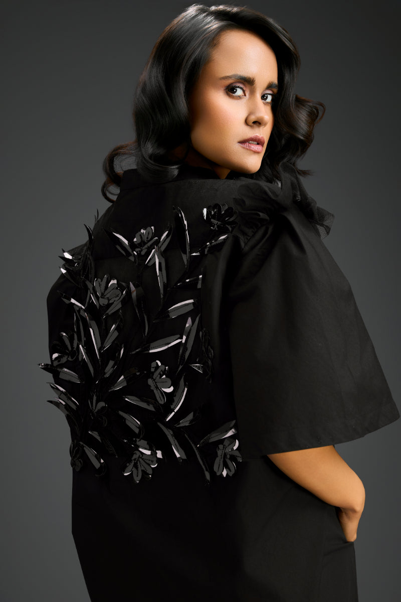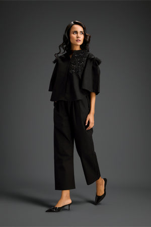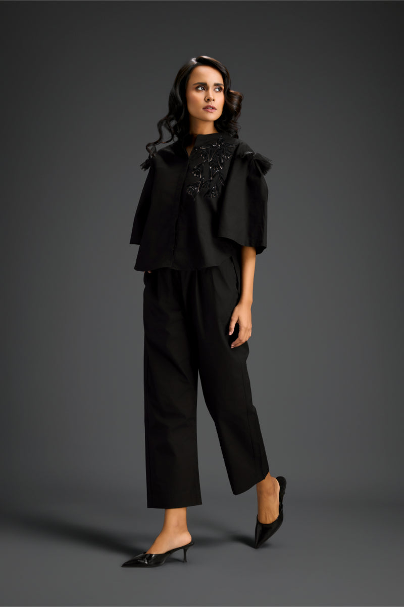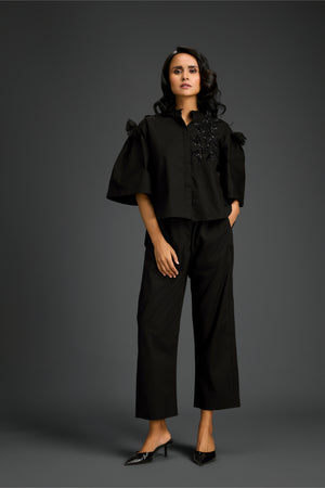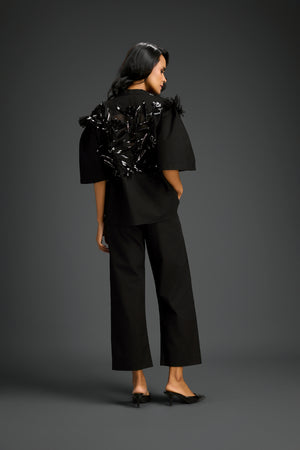 Structured Black Coord Set With Sheer Back With 3D Florals And Glossy Leaf Embellishments With Pants