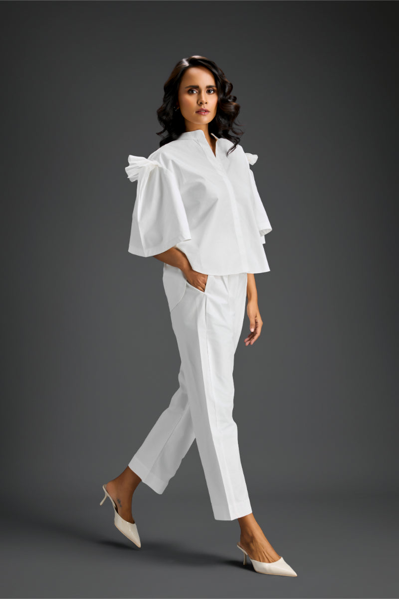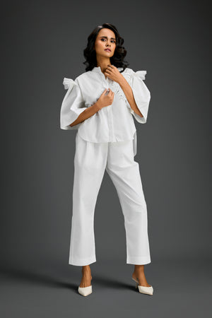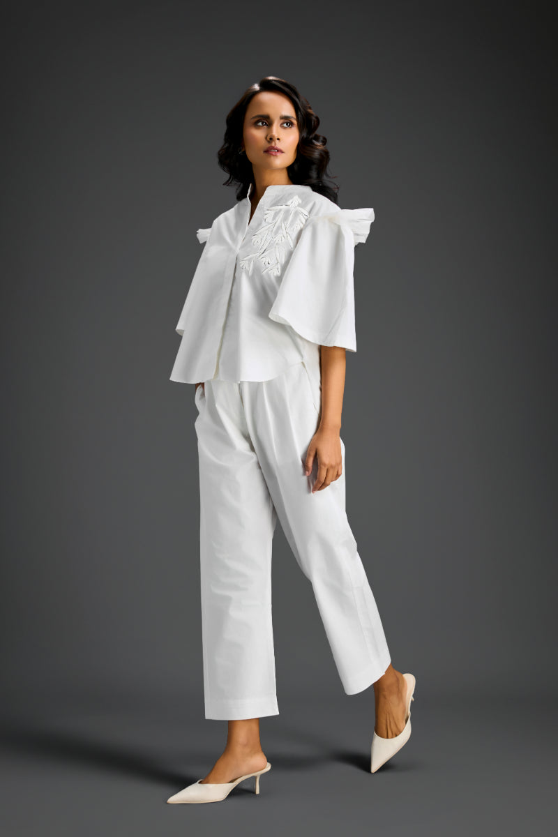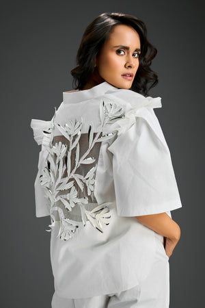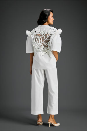 Structured White Coord Set With Sheer Back With 3D Florals And Glossy Leaf Embellishments With Pants