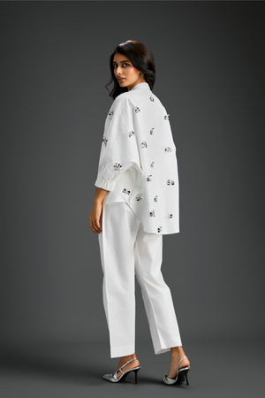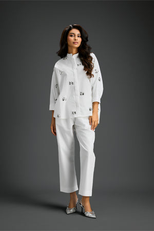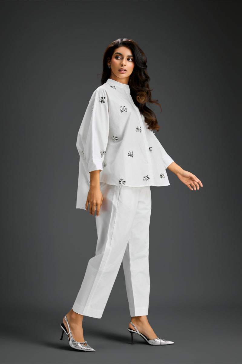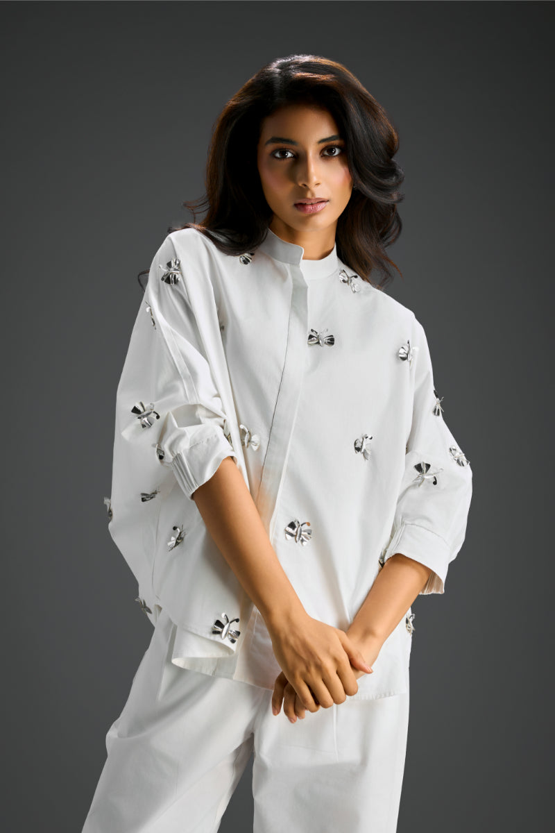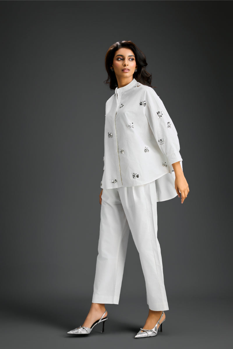 White Cotton Co-Ord Set Featuring A Pleated Cuff Shirt And Relaxed-Fit Pants, Detailed With Delicate Hand-Embellished Butterfly Motifs