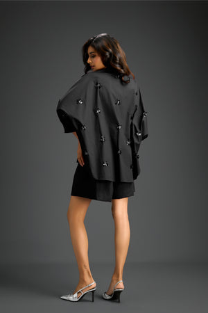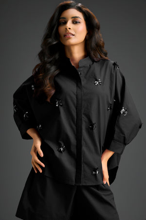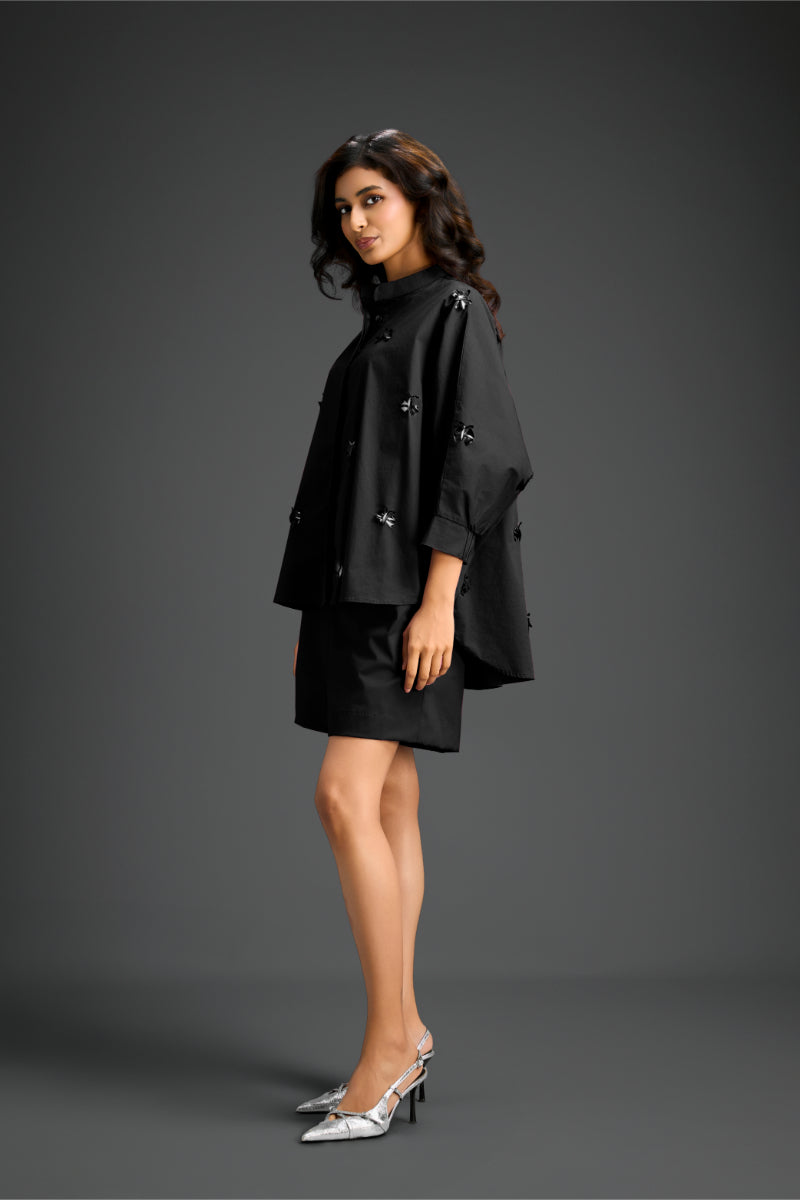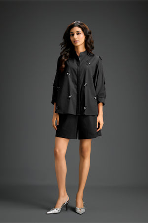 Black Cotton Co-Ord Set Featuring A Pleated Cuff Shirt And Relaxed Shorts, Detailed With Embellished Butterflies