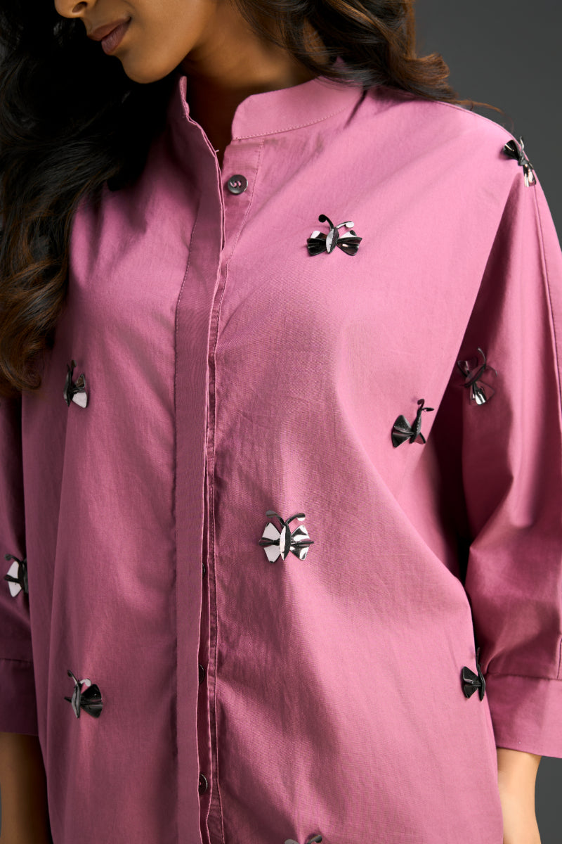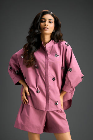 Pink Cotton Co-Ord Set Featuring A Pleated Cuff Shirt And Relaxed Shorts, Detailed With Delicate Hand-Embellished Butterfly Motifs