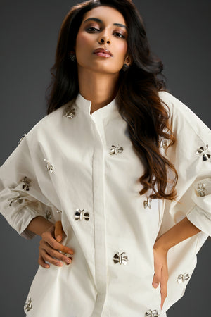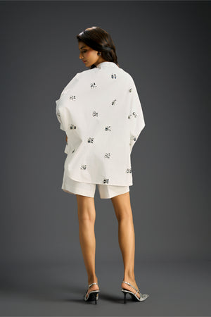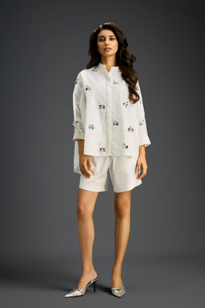 White Cotton Co-Ord Set Featuring A Pleated Cuff Shirt And Relaxed Shorts, Detailed With Delicate Hand-Embellished Butterfly Motifs