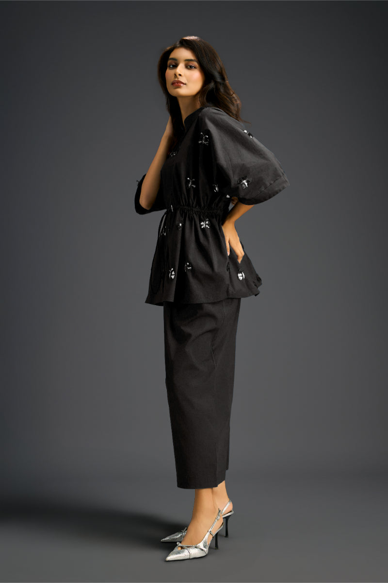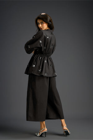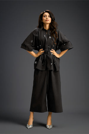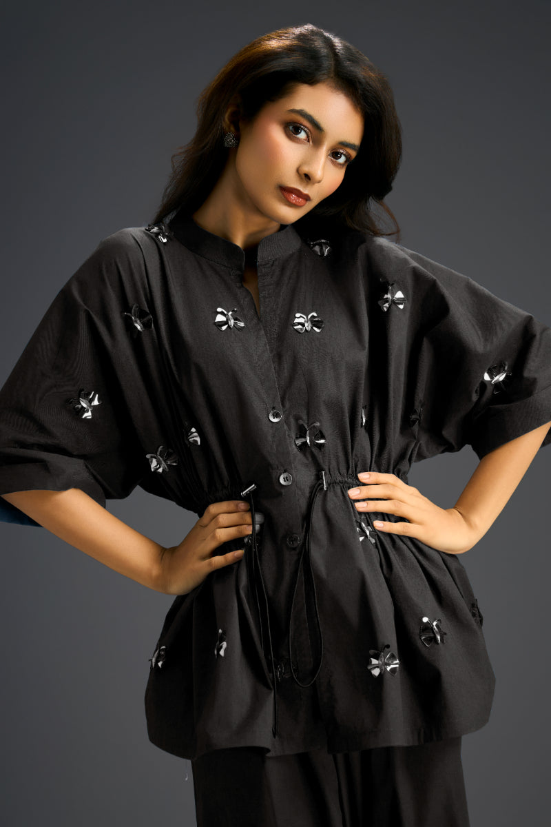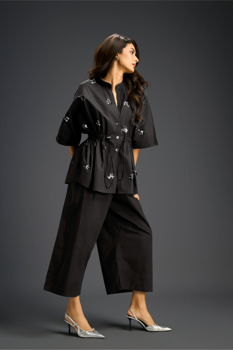 Black Cotton Co-Ord Set With A Drawstring-Waist Shirt And Wide-Leg Pants, Detailed With Delicate Hand-Embellished Butterfly Motifs