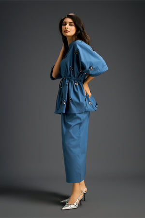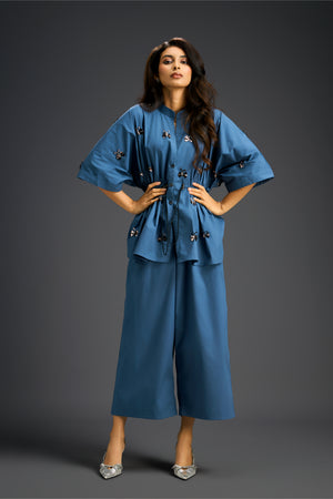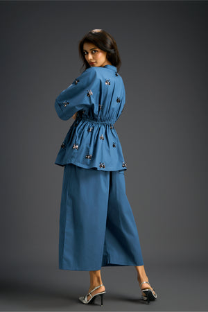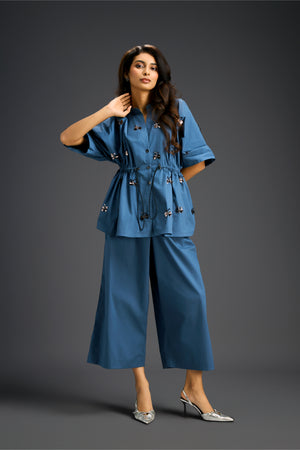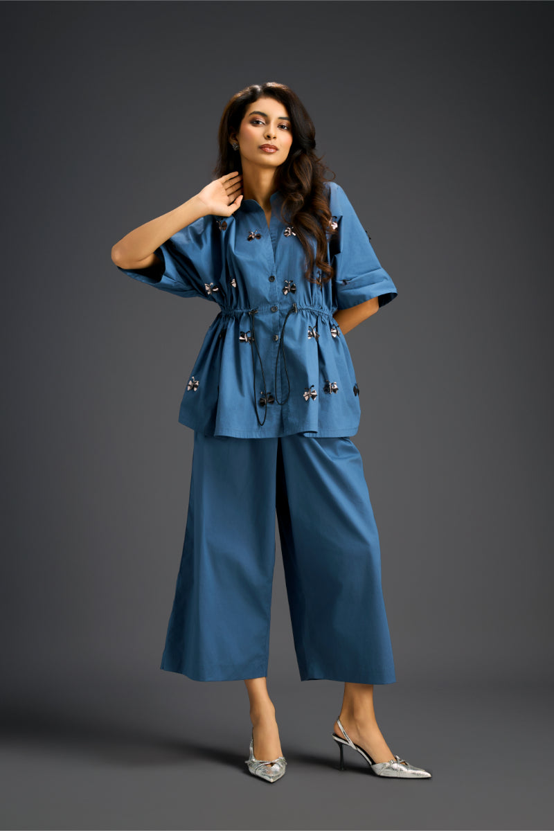 Blue Cotton Co-Ord Set With A Drawstring-Waist Shirt And Wide-Leg Pants, Detailed With Delicate Hand-Embellished Butterfly Motifs