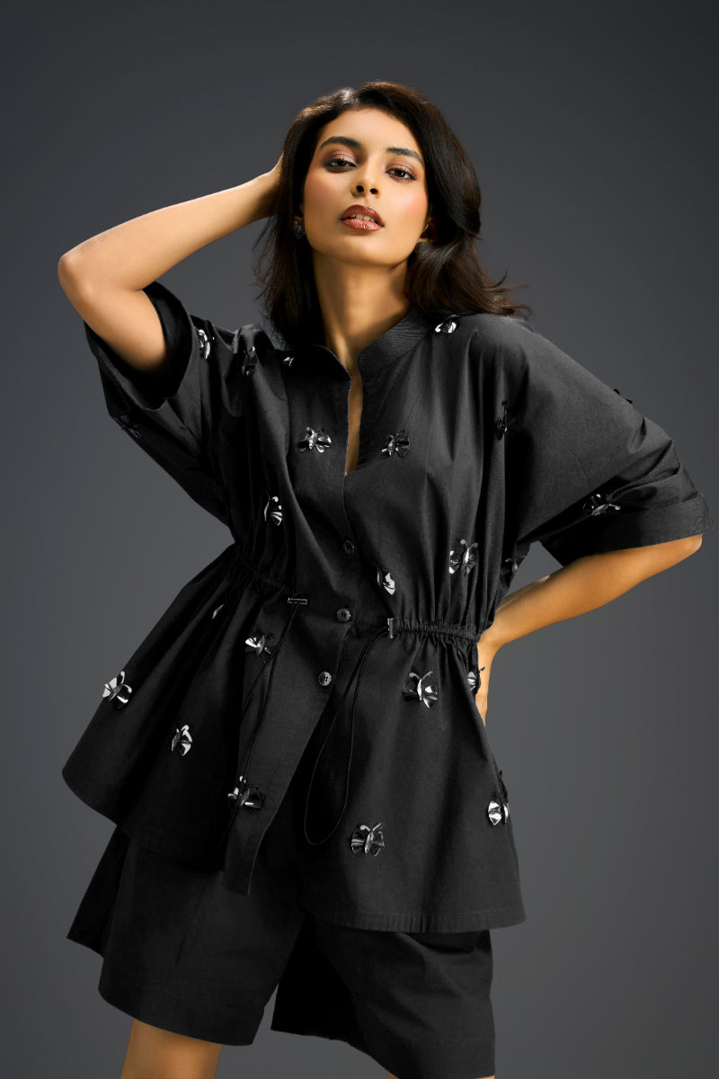 Black Cotton Co-Ord Set With A Drawstring-Waist Shirt And Tailored Shorts, Detailed With Delicate Hand-Embellished Butterfly Motifs