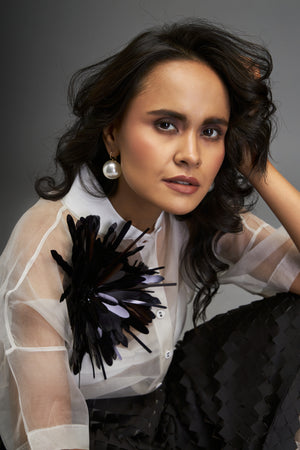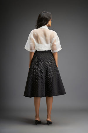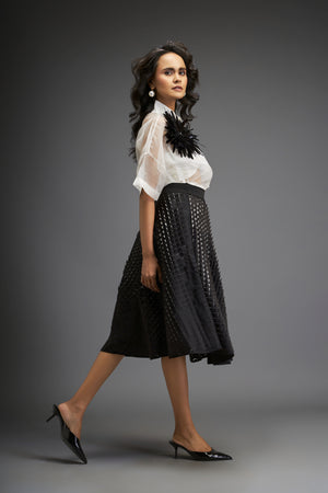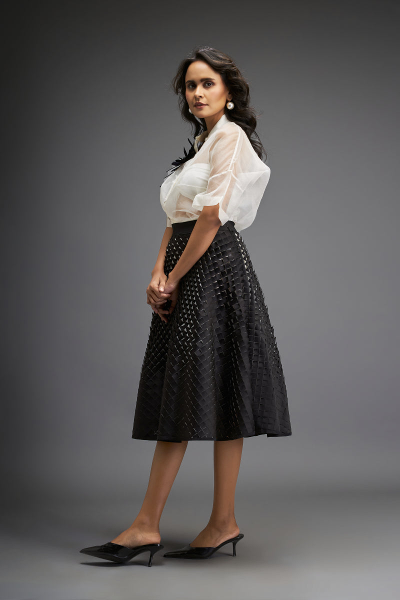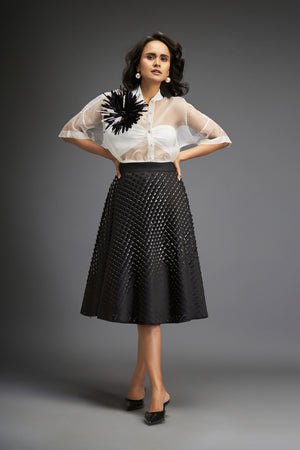 Chic Pure Organza Emsemble Featuring A Sheer Blouse With Bold Floral Detailing And Textured 3-D Skirt.