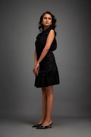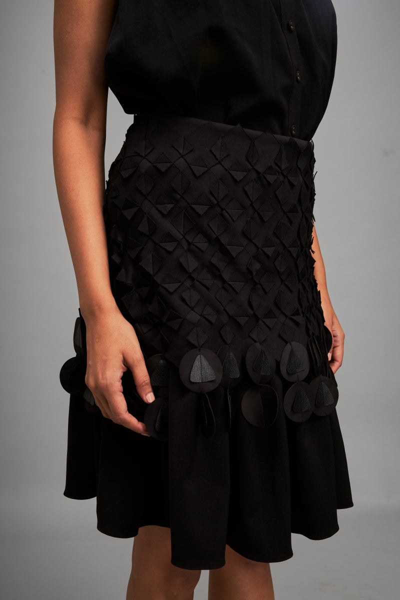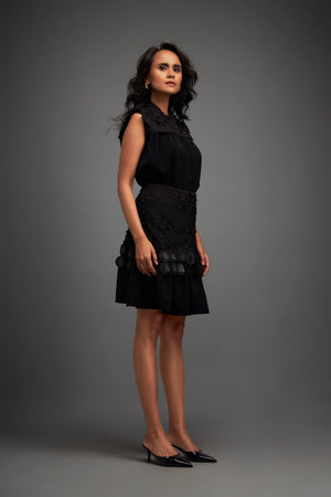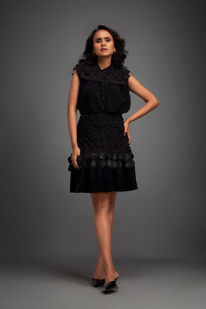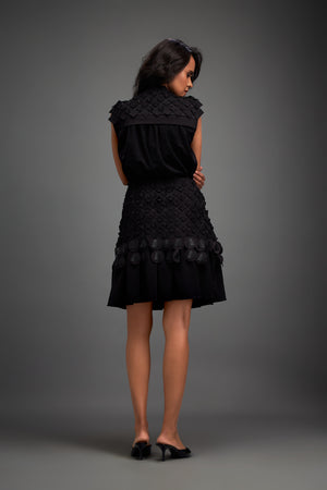 Sleeveless Buttoned Top With Intricate Geometric Textures And Appliques On Skirt