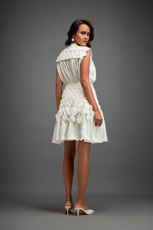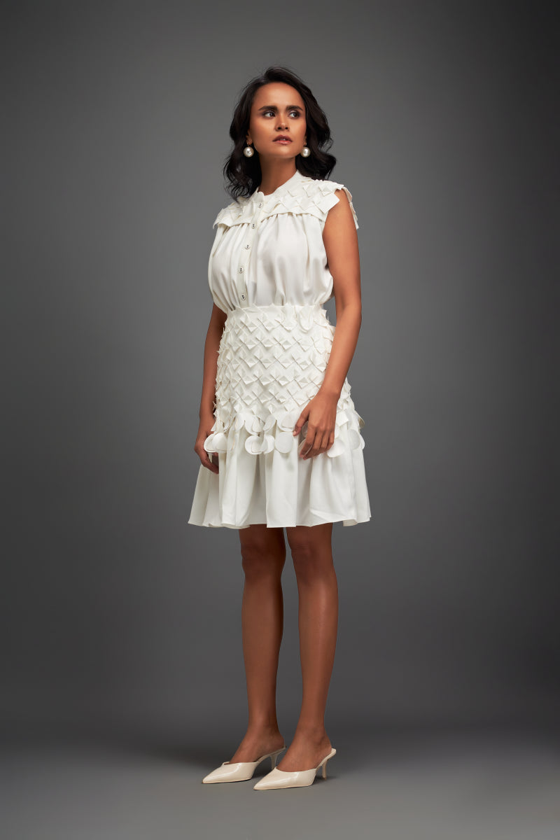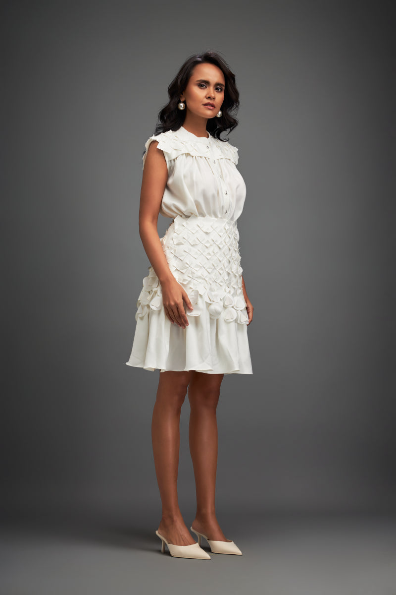 Sleeveless Buttoned Top With Intricate Geometric Textures And Appliques On Skirt