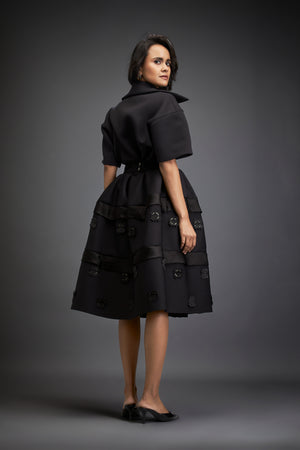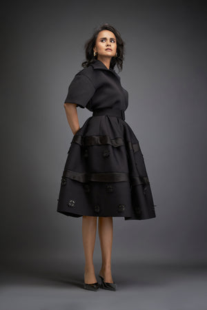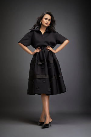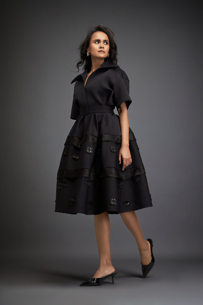 Black Chic Midi Dress With Collared, Belted Waist, Layered Skirt With Subtle Green Floral Embellishments