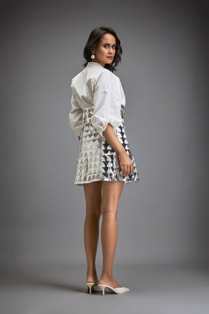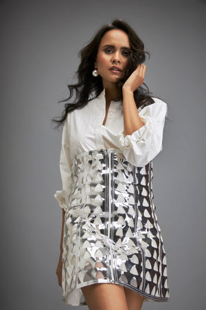 White Shirt Paired With A Metallic Silver Mini Skirt With Triangle Cutouts