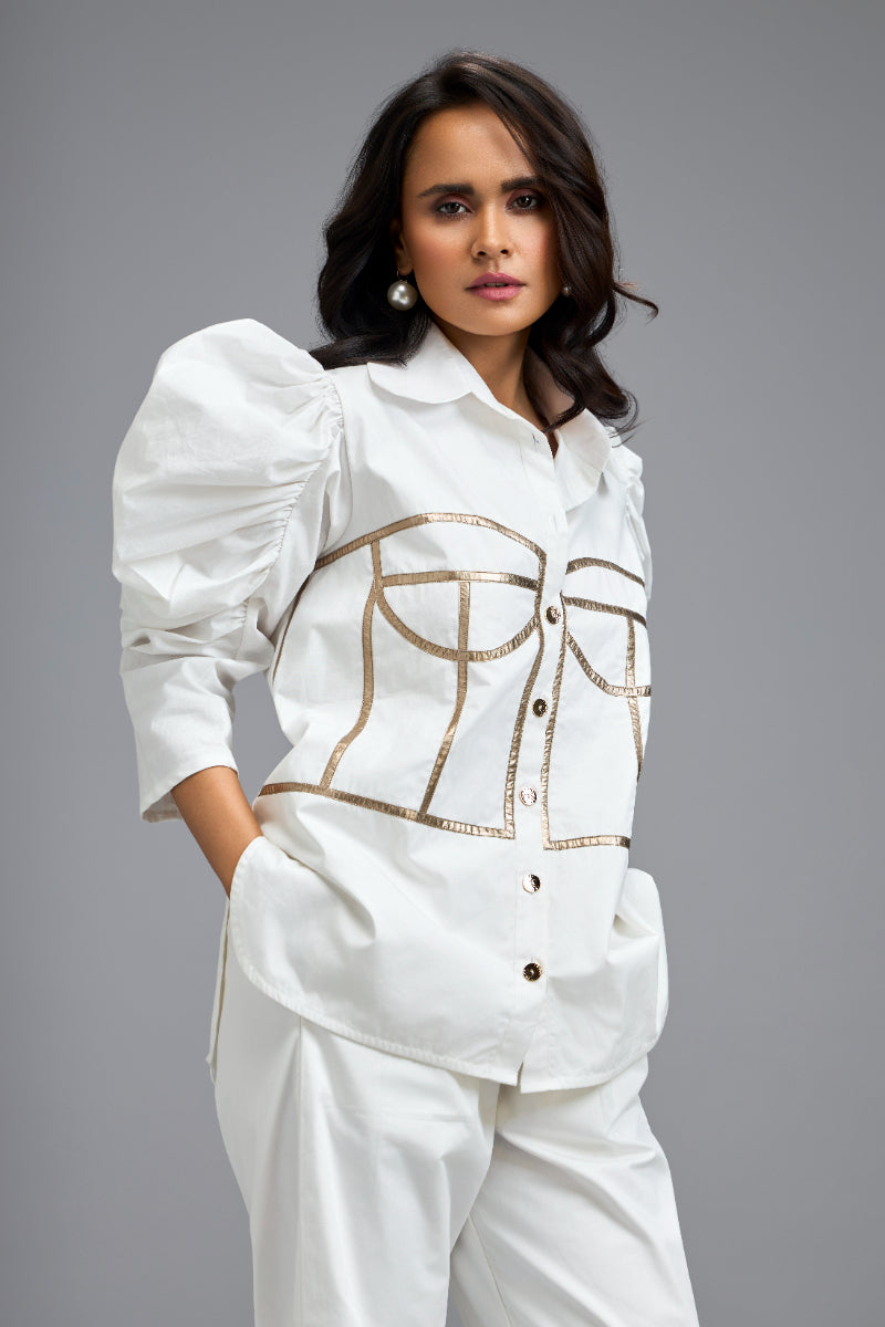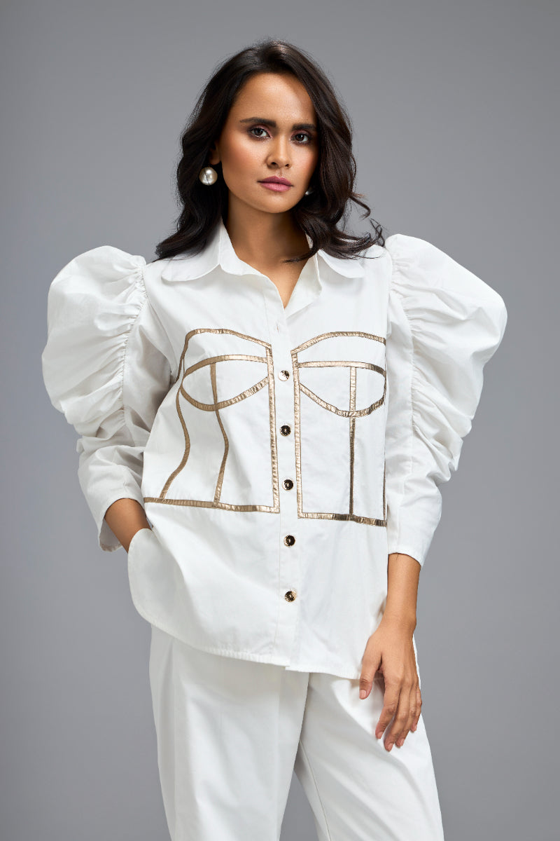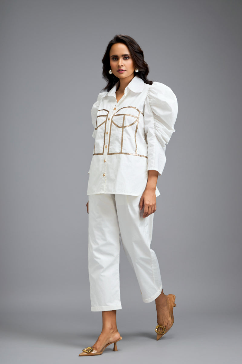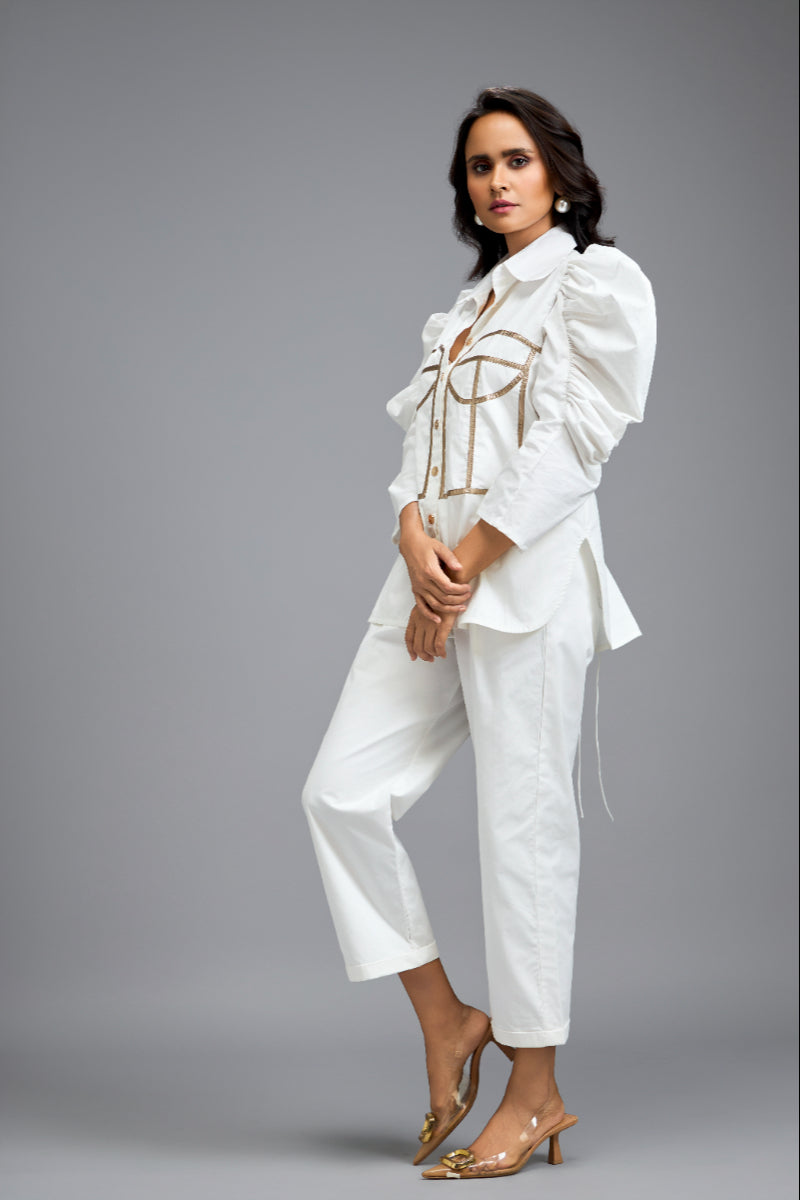 Chic White Co-Ord Set With Puff Sleeves, Corset Detailing Paired With Pants
