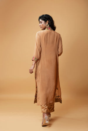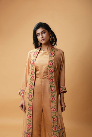 Featuring A Light Bronze Coloured Jumpsuit And Jacket Set With Floral Motifs On The Jacket. The Jumpsuit Consists Of Two Pockets .