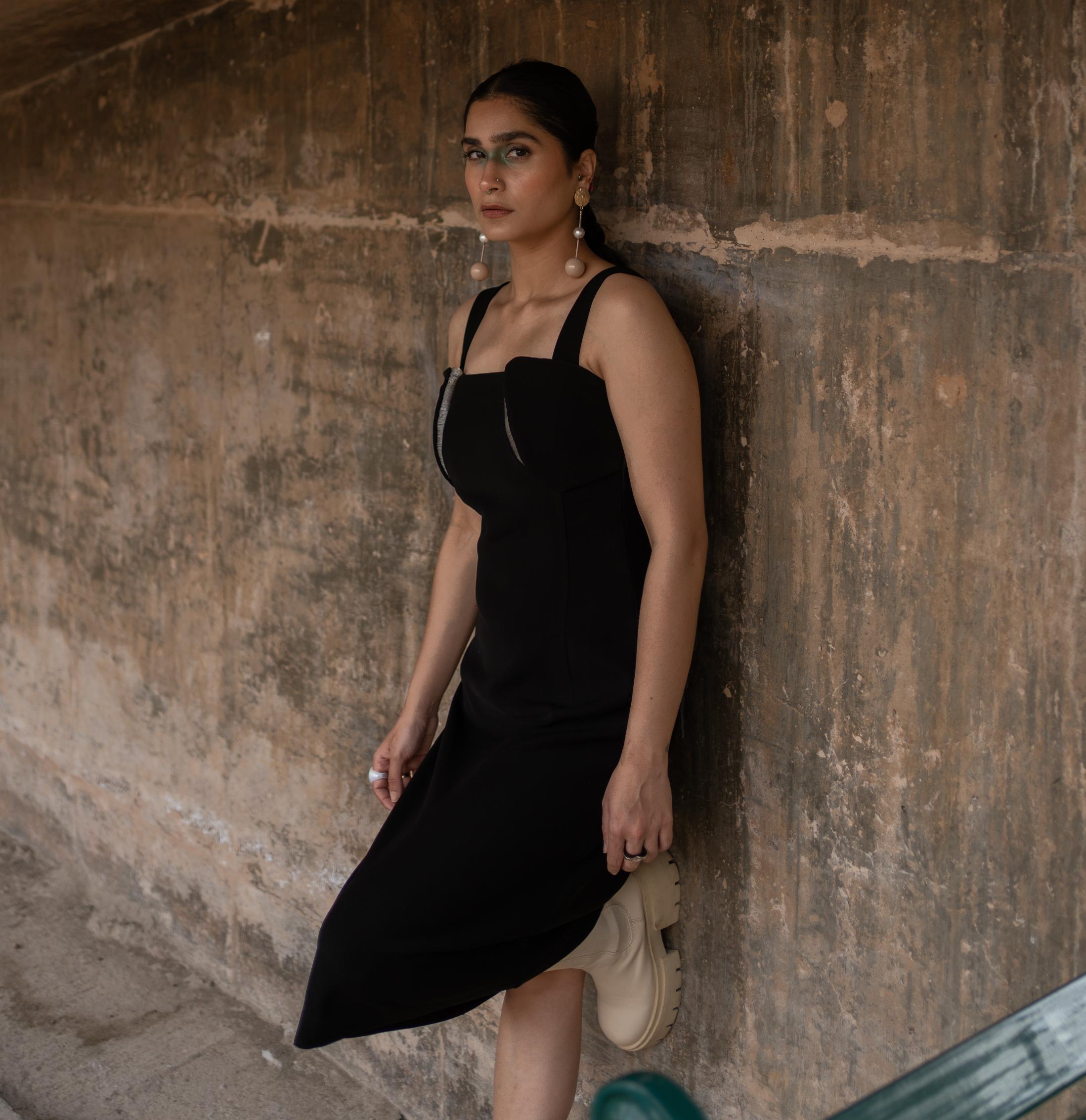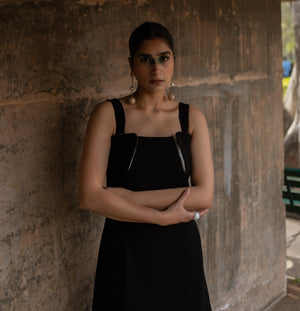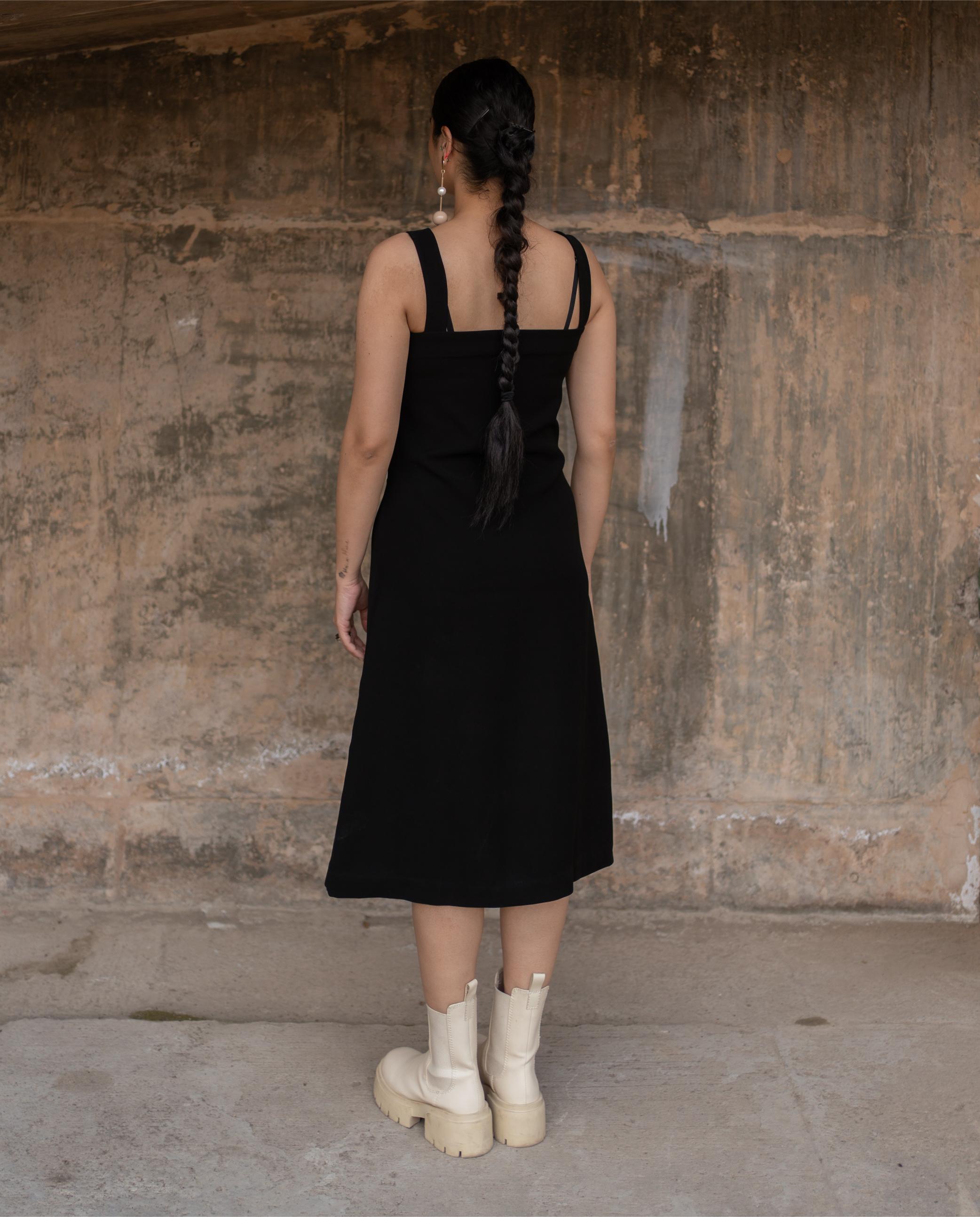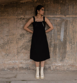 Contoured torso dress featuring 3D PVC detail at the chest, with straps , it is shaped with a square neckline, zipped side , knee covering length, a-line dress , fully lined