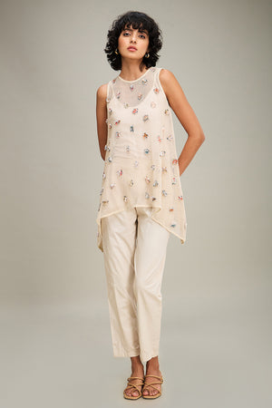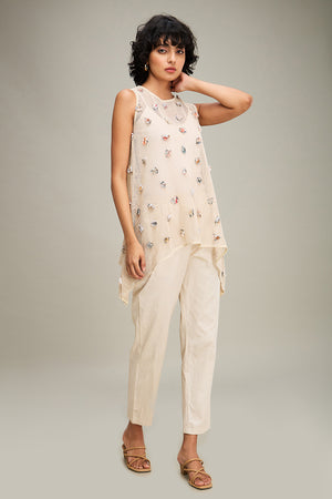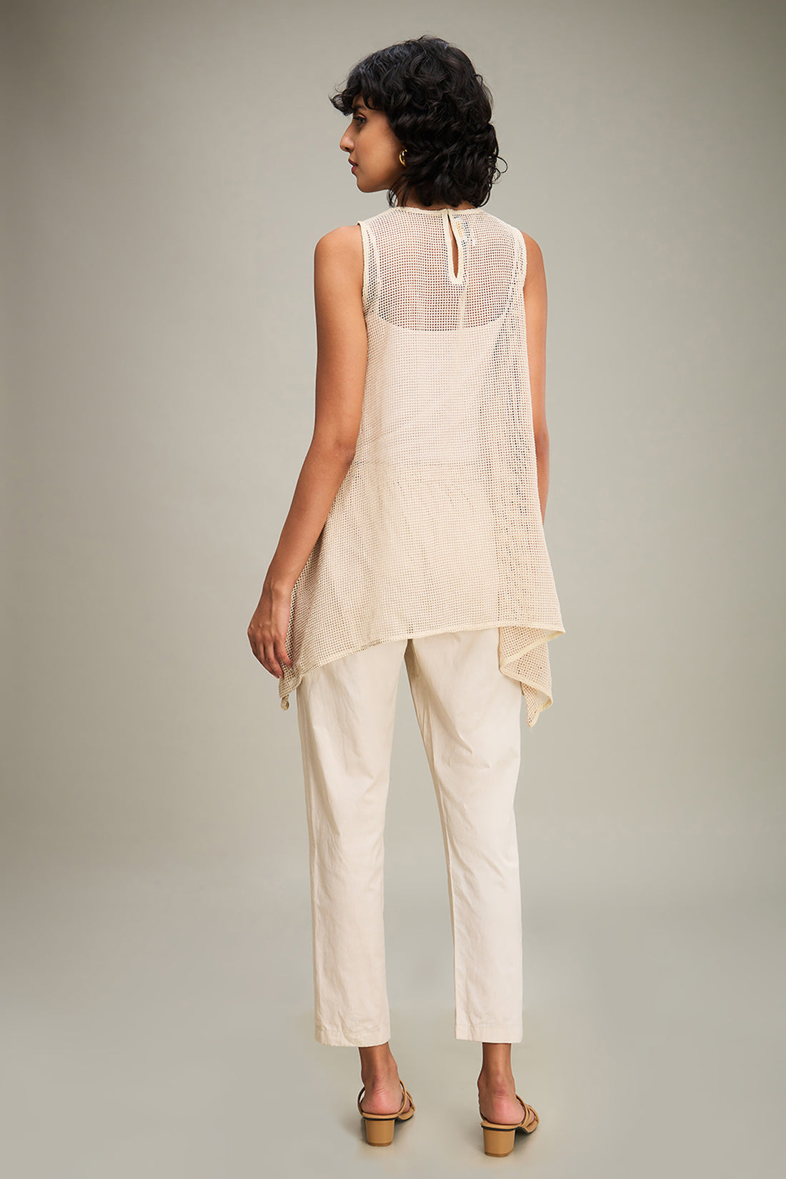 Off White Conversational Top in Handloom Net comes with a slip, paired with pants in Muslin Slub
