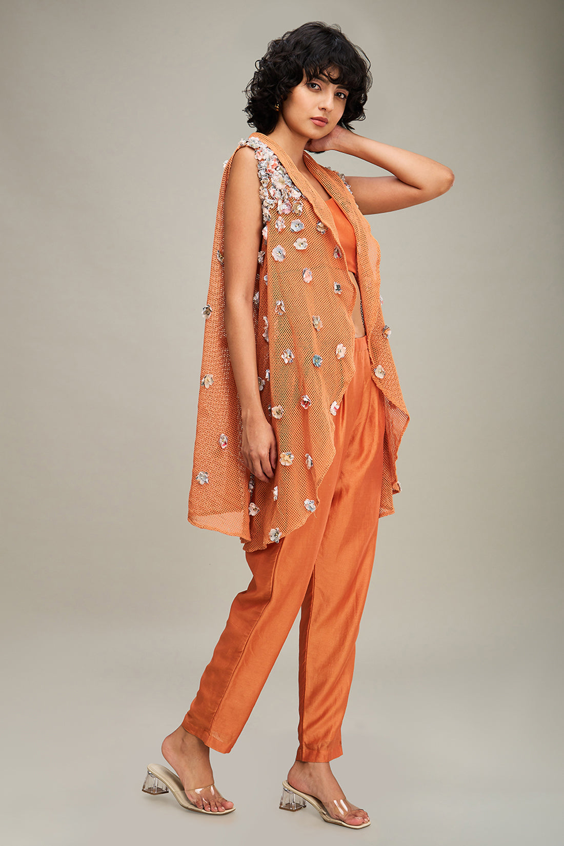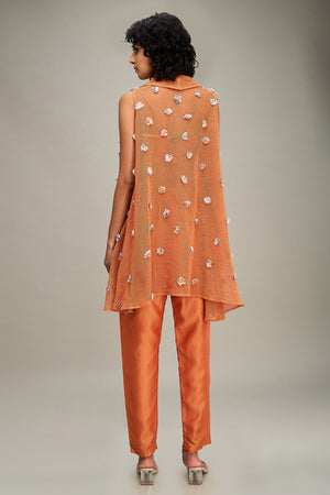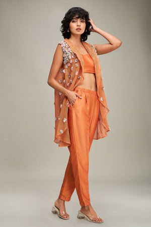 Orange Conversational Embellished Bustier and Pants in Chanderi Paired with High-low Hem Cape in Handloom Net.