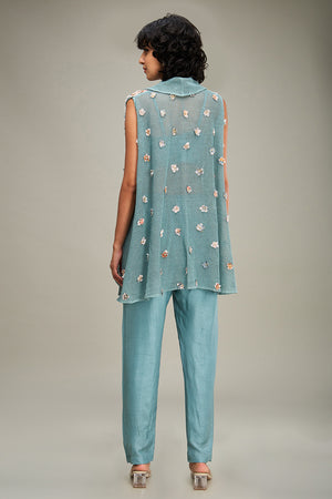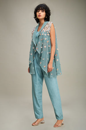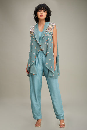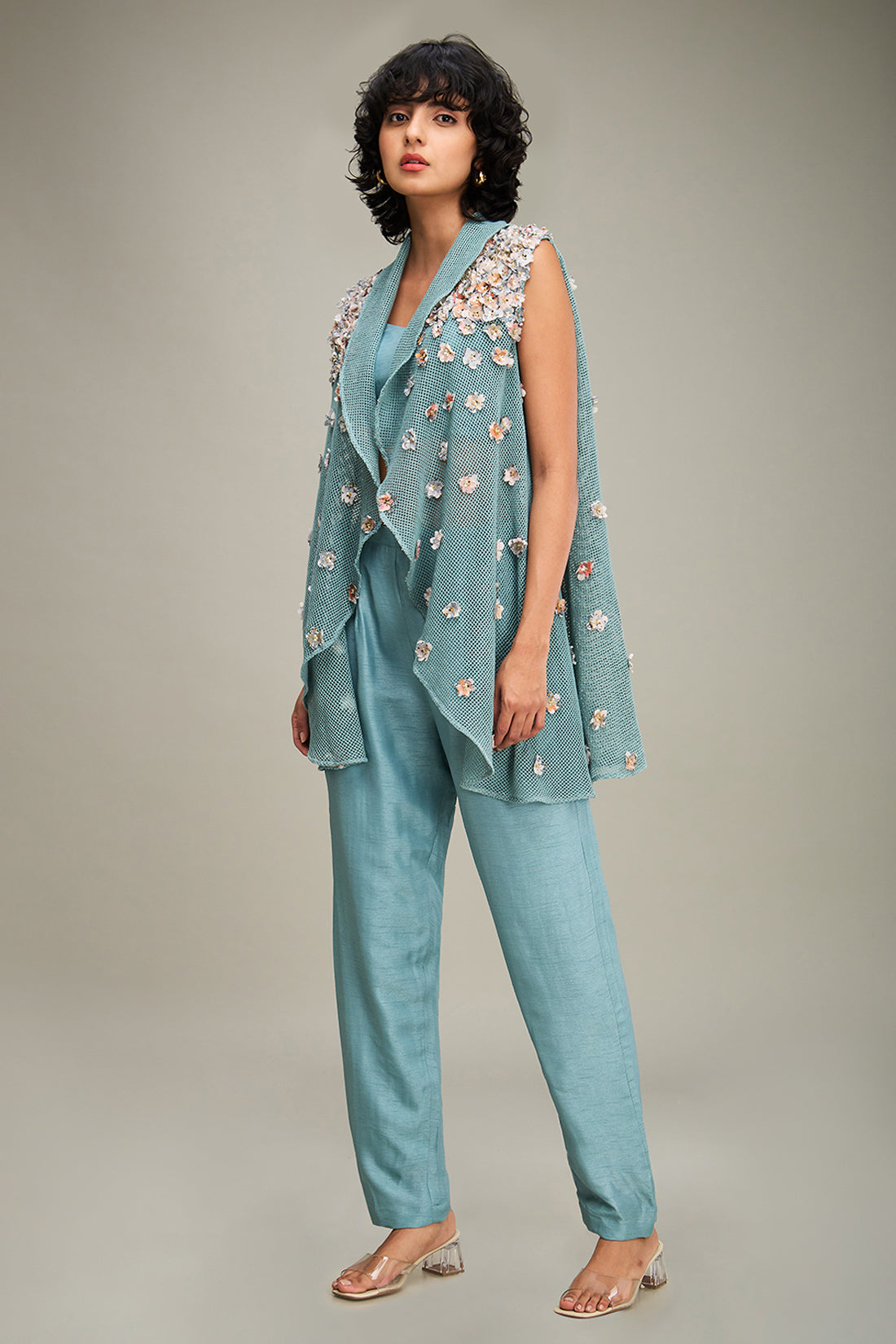 Green Conversational Embellished Bustier and Pants in Chanderi Paired with High-low Hem Cape in Handloom Net.