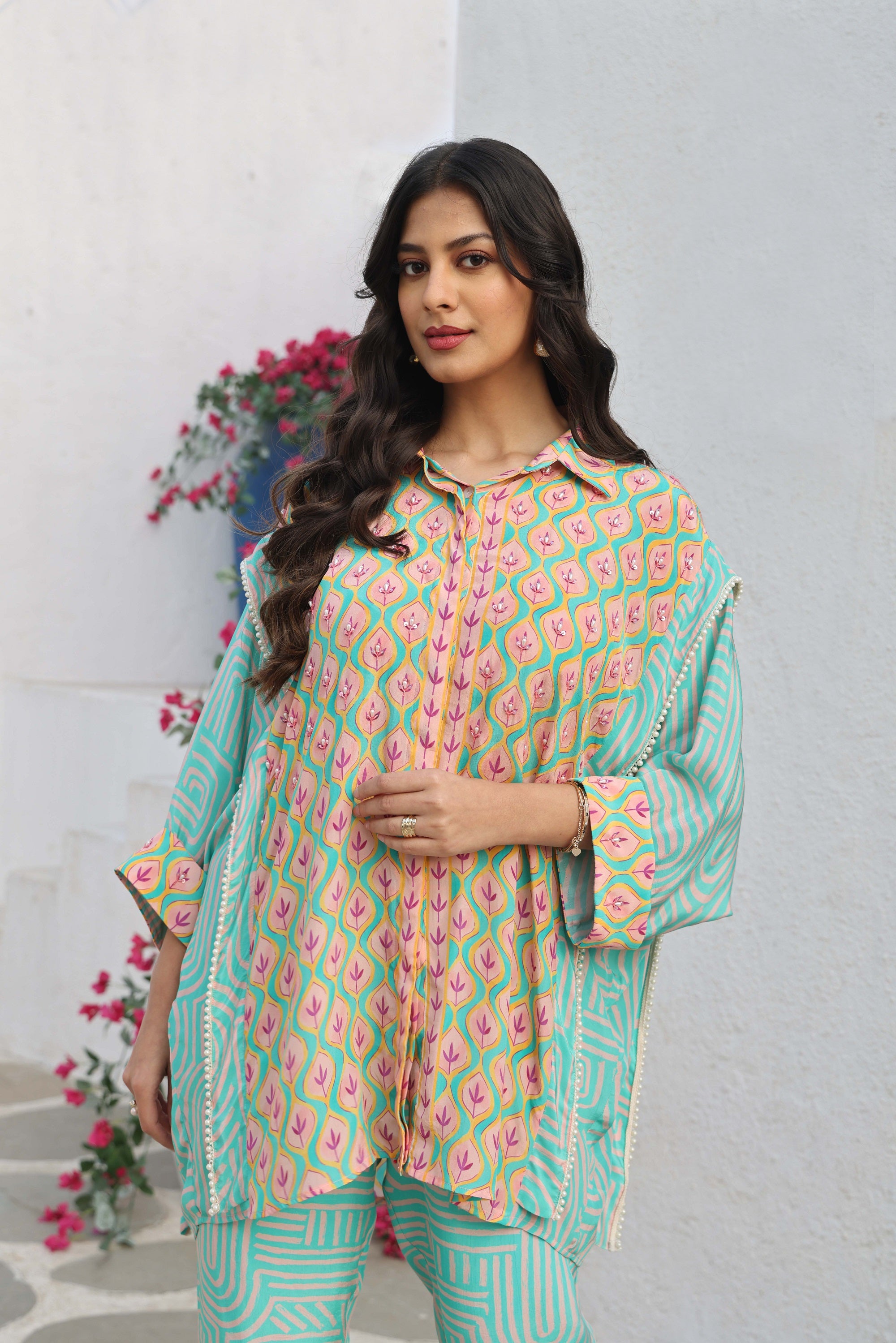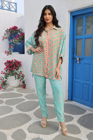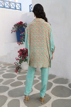 Printed Co-Ord Set Made From Premium Georgette Fabric. It Consists Of A Full Sleeves Collared Blouse Paired With Maze Printed Straight Pants. The Shirt Features Intricate Hand Embroidery With Lace As Trim.