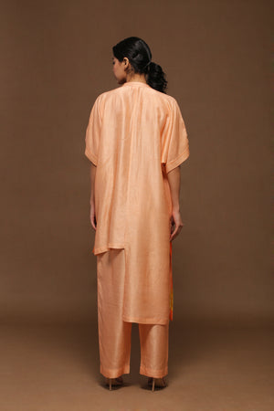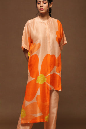 Textile Print Variation of A two piece rich dupion silk set comprised of the double pleats detail madarin collar tunic and parellel pants.