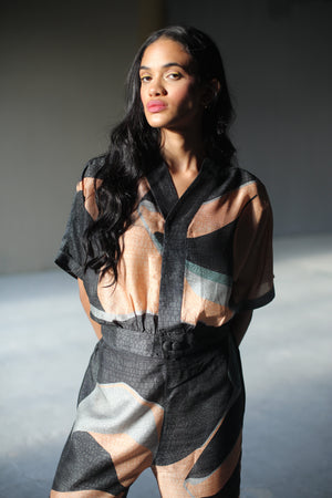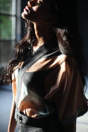 A two piece dupion silk set comprised of abstract colorful print straight kurta with bartack stitch at the neck and parallel pants with fusion textile play of abstract print.
