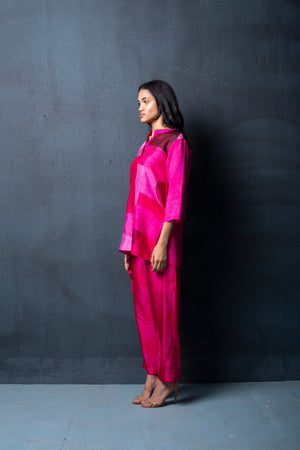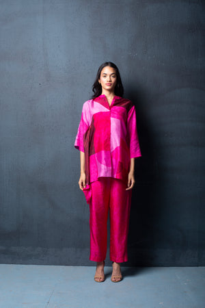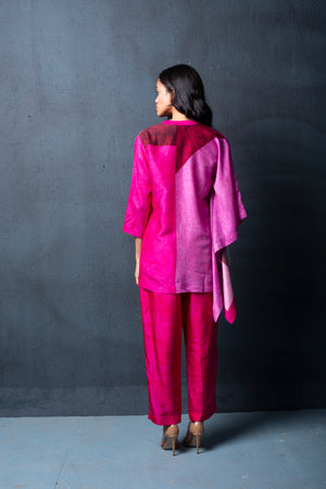 A two piece dupion silk set comprised of abstract geometric print with bell sleeves and parallel pants with fusion textile play of abstract print.
