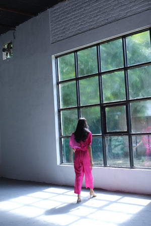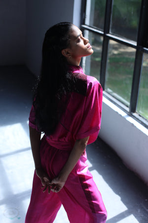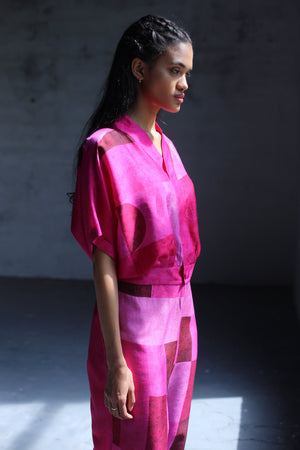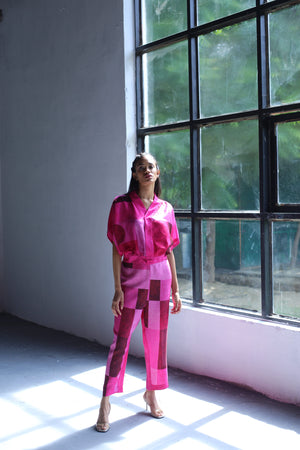 A two piece dupion silk set comprised of geometric abstract print with beautiful blouse and parallel pants with fusion textile play of abstract print.
