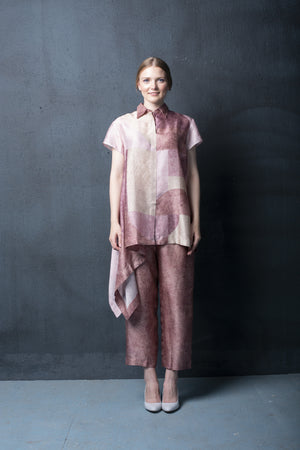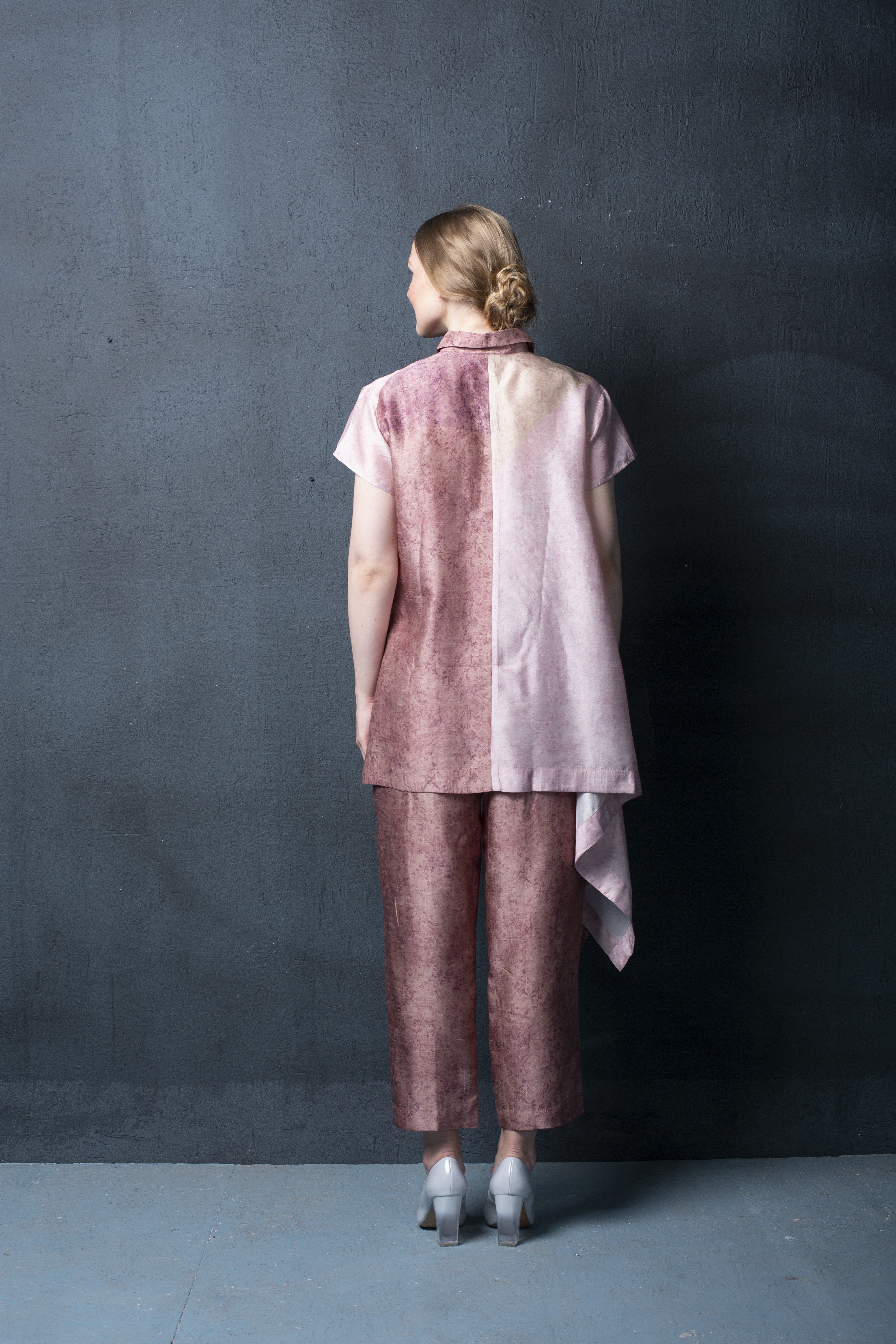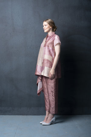 A two piece dupion silk set comprised of geometrical abstract print ,asymemtrical hemline and parallel pants with fusion textile play of abstract print.