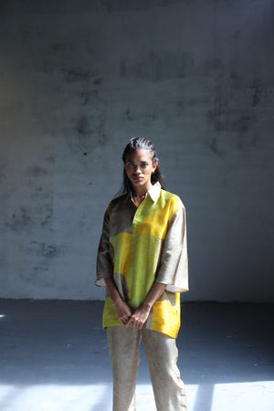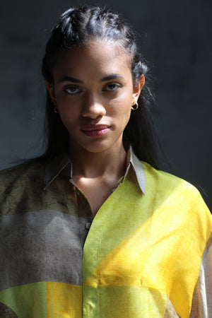 A two piece dupion silk set comprised of abstract geometric print with bell sleeves and parallel pants with fusion textile play of abstract print.