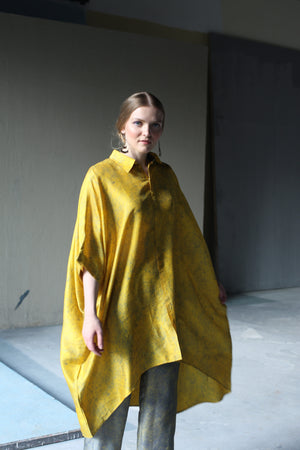 A two piece dupion silk set comprised of miniature floral print with free flowing tunic and parallel pants with fusion textile play of miniature floral print.