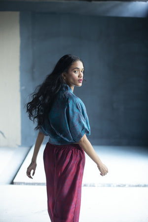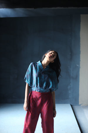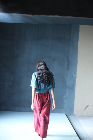A two piece dupion silk set comprised of a short blouse with miniature floral print and parallel pants with fusion textile play of miniature floral print.