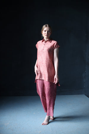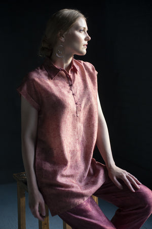 A two piece dupion silk set comprised of miniature floral print with free flowing tunic and parallel pants with fusion textile play of miniature floral print.