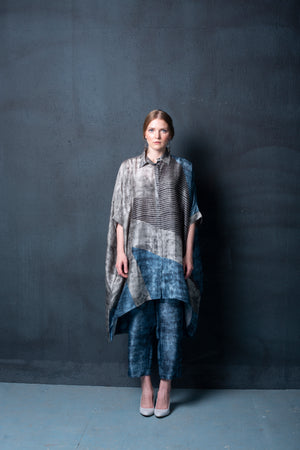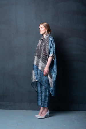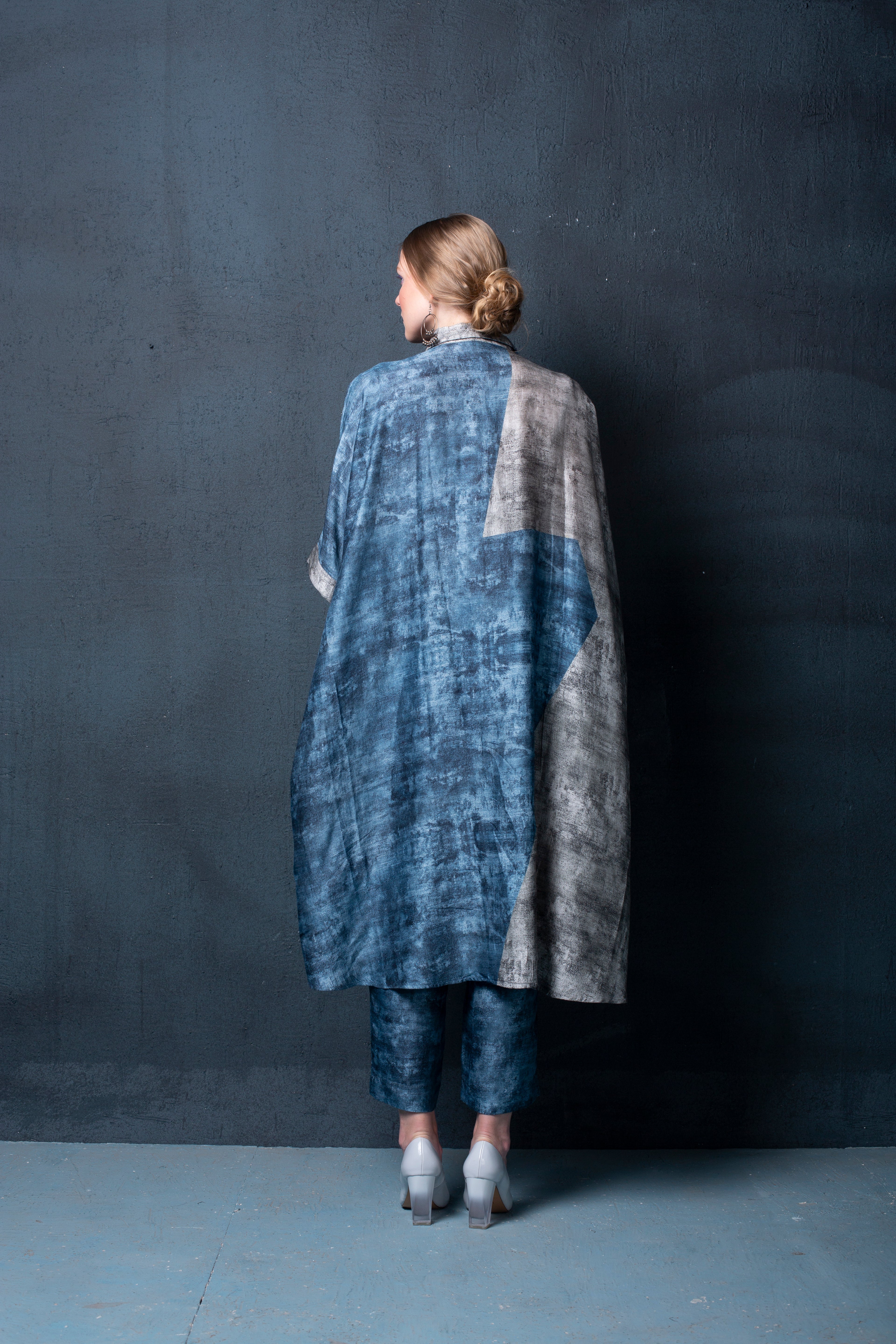 A two piece dupion silk set comprised of abstract geometrical print kurta with high low hemline and parallel pants with fusion textile play of abstract geometrical print.