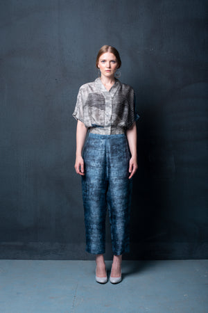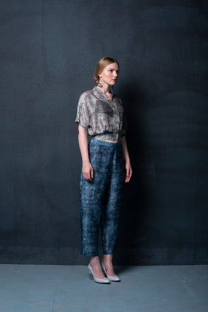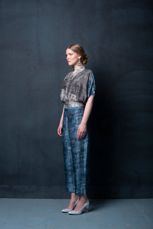 A two piece dupion silk set comprised of a short blouse with abstract geometrical print and parallel pants with fusion textile play of abstract geometrical print.