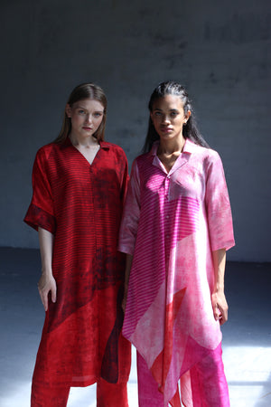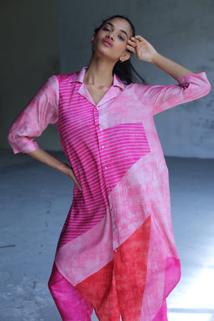 A two piece dupion silk set comprised of geometrical abstract print ,asymemtrical hemline and parallel pants with fusion textile play of abstract print.