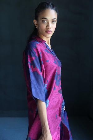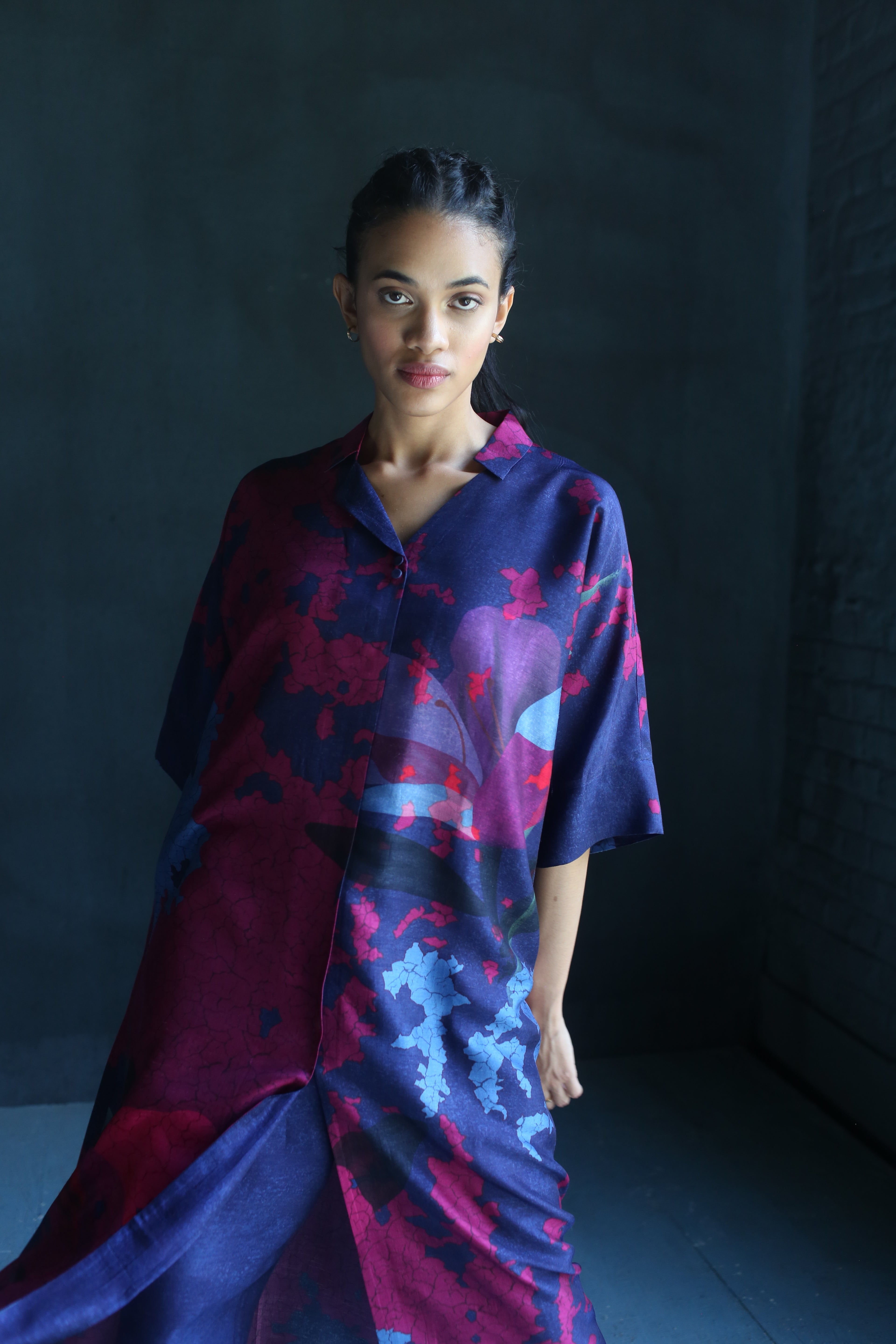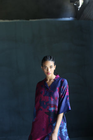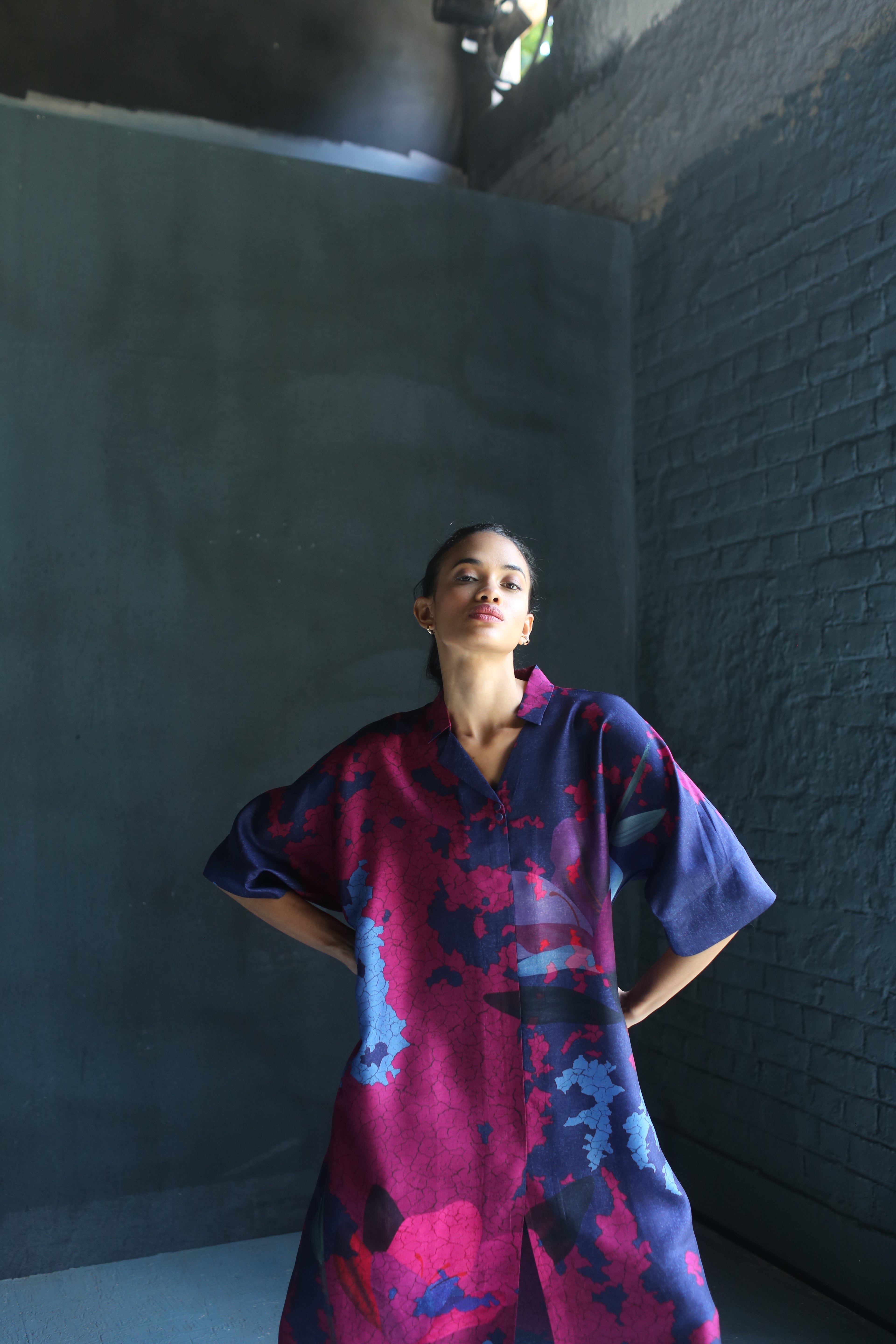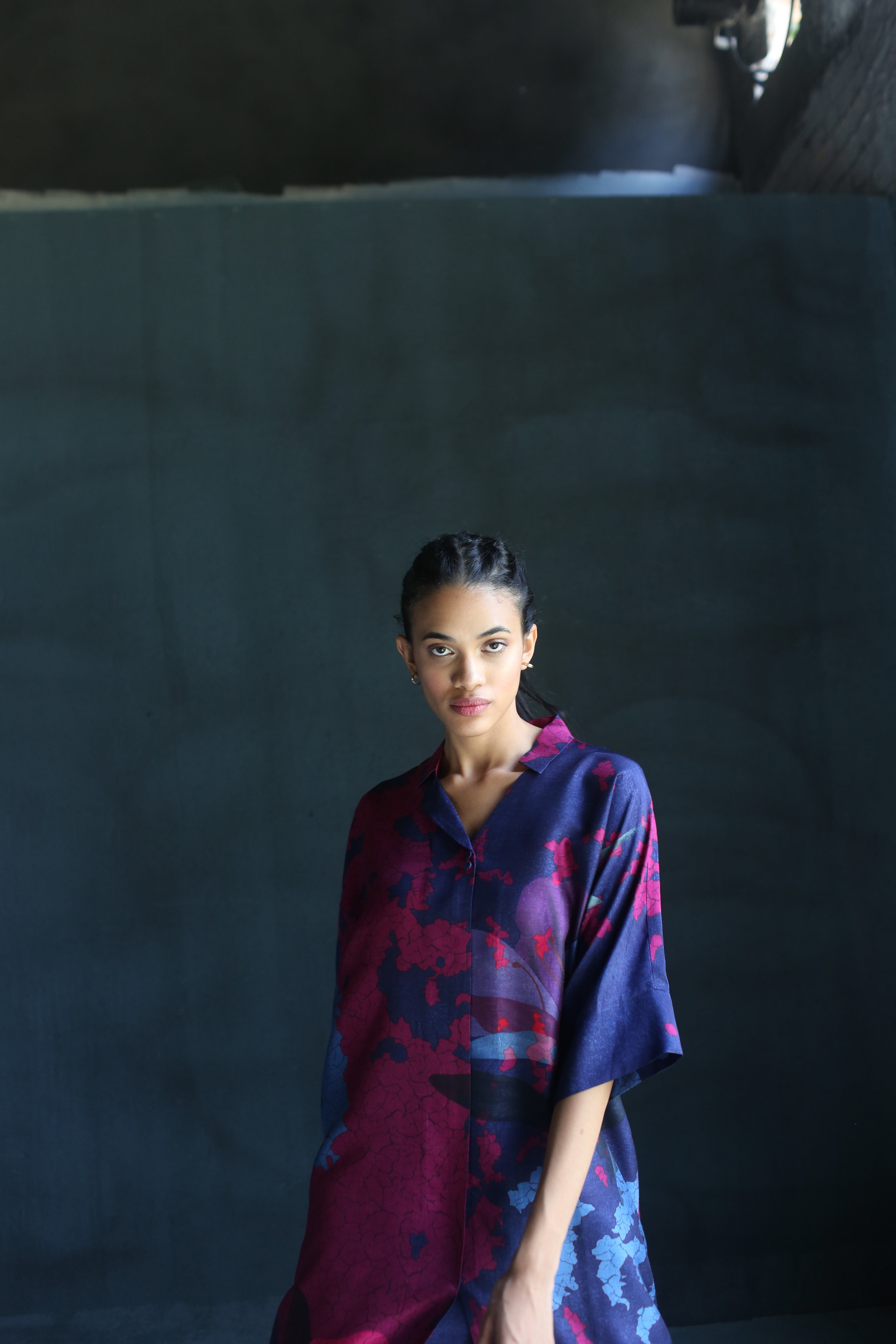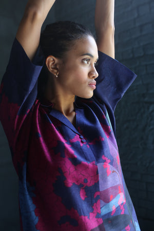 A two piece dupion silk set comprised of half collar, abstract print straight kurta with and parallel pants with fusion textile play of abstract print.