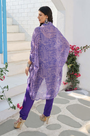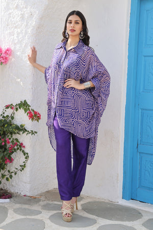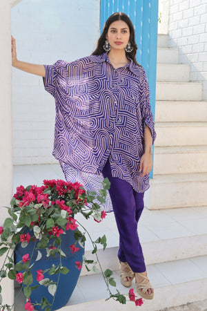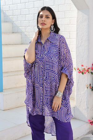 Printed Co-Ord Set Made From Premium Georgette Fabric. It Consists Of Kaftan Collared Shirt With Cuff As Sleeve Details, Paired With Shanton Straight Pants.