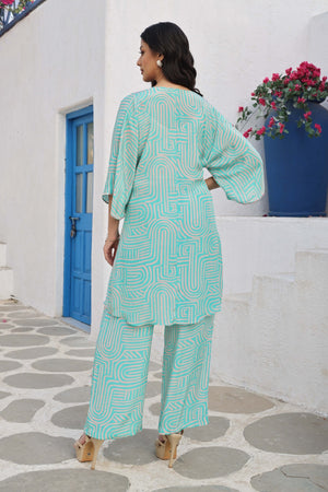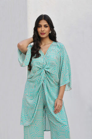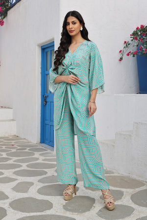 Premium Printed Crepe Set With Twisted Knot Detailing At The Waist Paired With Wide Legged Pants. The Outfit Has Detailing Of Sequin Embroidery On Top And Sleeve Hem.