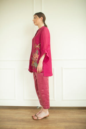 A Set Of Two Relax Fit Handloom Linen Silk Tunic Set With Hand Applique Embroidery Details.