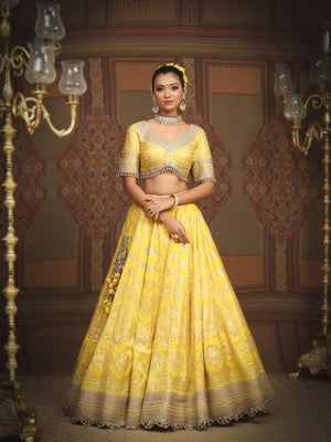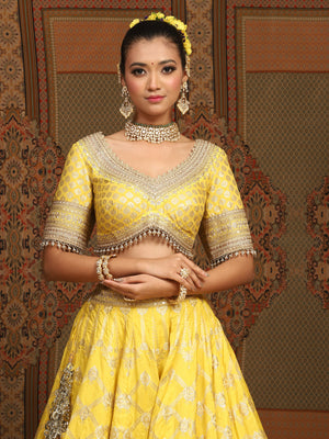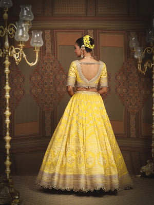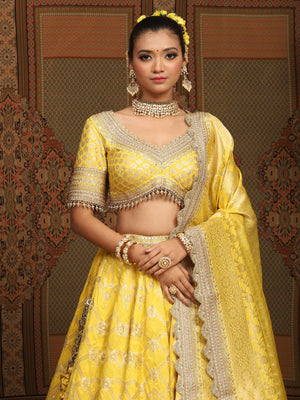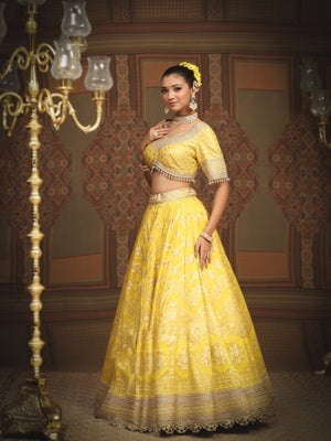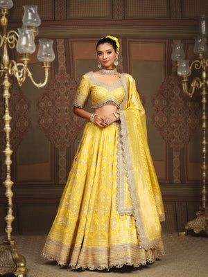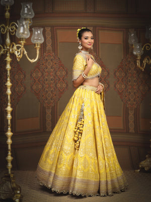 Discover enchanting elegance in our magnificent Lemon Yellow Kalidar Banarasi Lehenga. The intricate Gota, Dori and Badla work, graces the ensemble. The Banarasi dupatta adds a touch of tradition, while the blouse, boasting a paan neckline and delicate Gota detailing, exudes refined elegance. This masterpiece unites heritage and contemporary allure, offering a radiant look that captures attention.