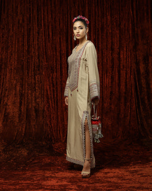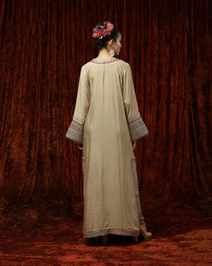 Featuring a Light Gold & Maroon Kurta kaftan in Silk Chanderi and with fine gota, dori, badla work.