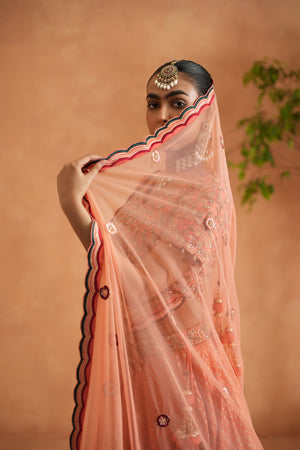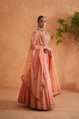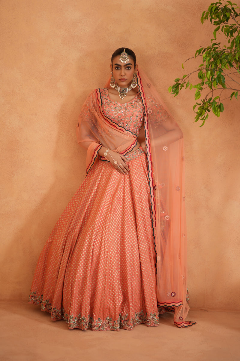 Deepika Chadha's stunning coral dupion silk fabric blouse beautifully adorned with intricate thread, dabka, seuins, cutdana embroidery. The flowy Banarsi brocade fabric lehenga with beautifully hand embroidered borders adds a touch of sophistication to your look, it is paired with soft net dupatta with multi color thread and hand embroidery on borders and ensures comfort all day long and is perfect for wedding and festive season.