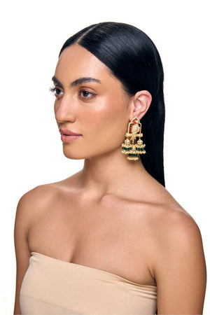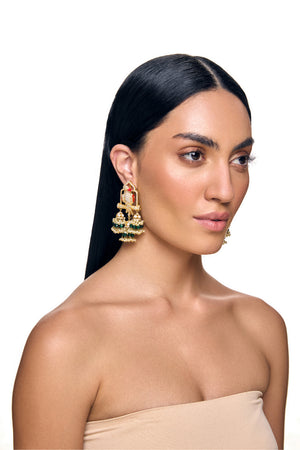 Medium length earrings, studded with Beautiful coral parrots, seated on studded swings.