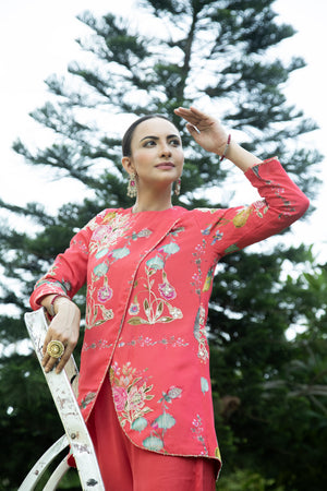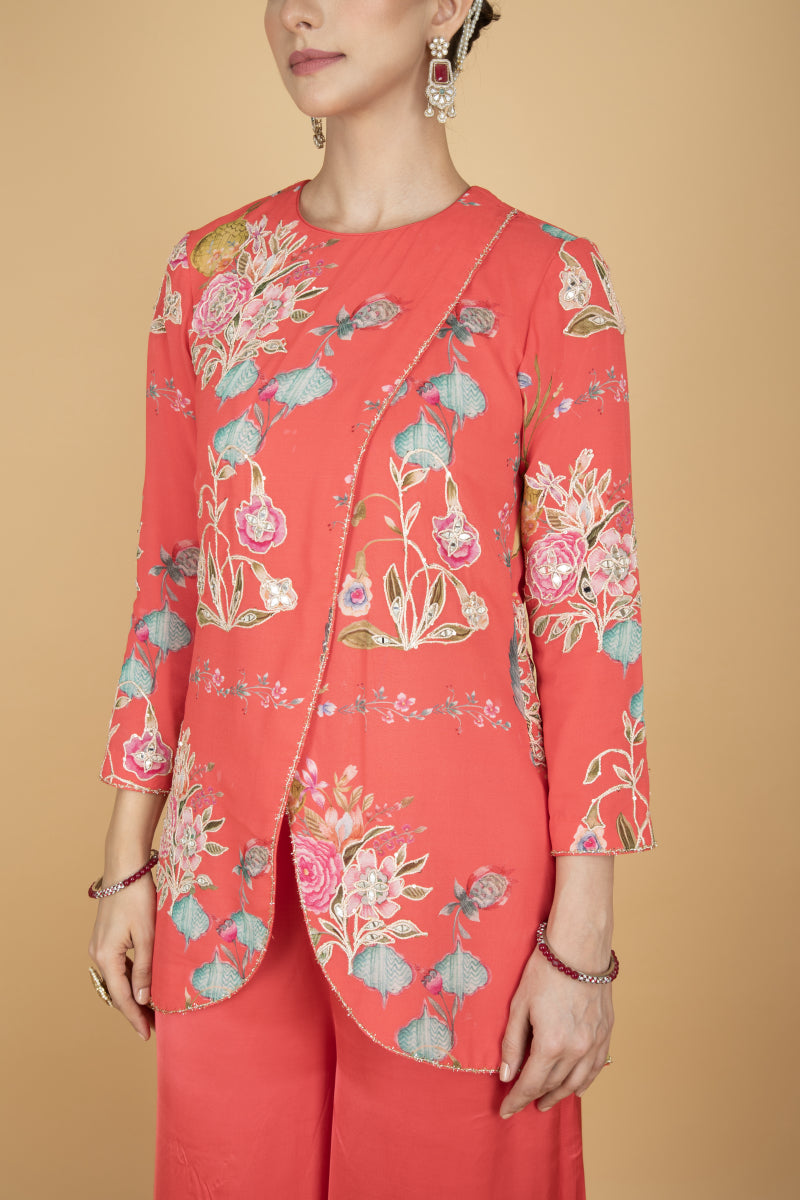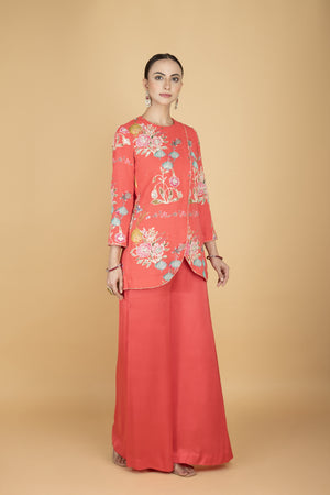 Featuring a coral floral printed overlay top in cotton silk, enhanced with delicate embroidery, paired with coordinating modal silk pants for a chic and contemporary silhouette.