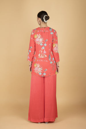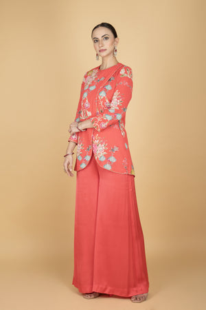 Coral Pink Floral Print Embroidered Overlay Top W/Pants
