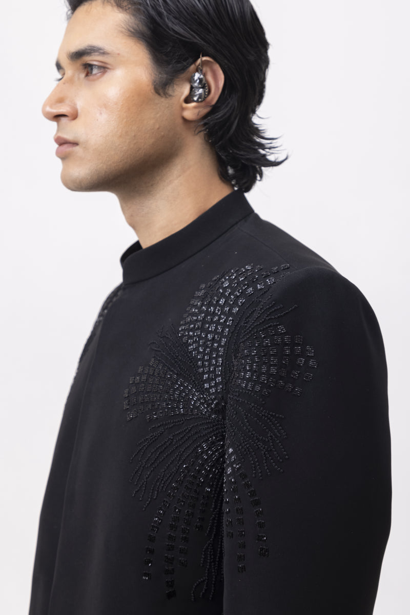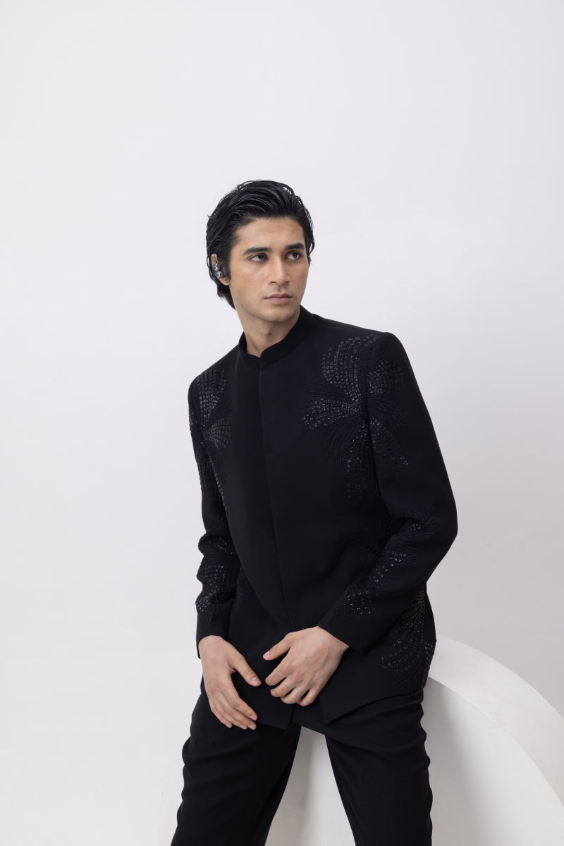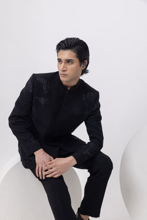A structured black Bandhgala featuring intricate shimmer detailing that flows across the shoulders and sleeves like kinetic energy. Paired with tailored trousers, this ensemble blends regality with modern sophistication. Ideal for formal receptions, black-tie weddings, or an evening where nothing less than commanding will do.