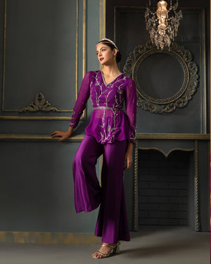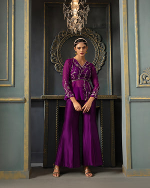 A beautiful showcase of craftsmanship,blending traditional motifs with modern shilloutes adds lively touch to our this peplum organza top paired with pure Chanderi flared bottom.