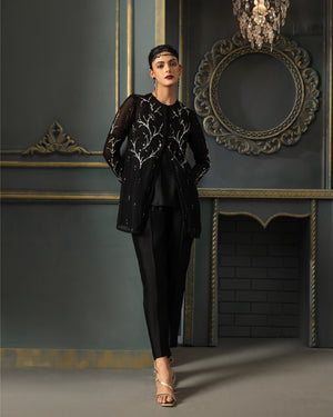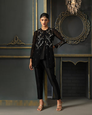 Classic to perfection our black organza jacket paired with pure Chanderi pant is Must have in wardrobe pieces .Meticulously hand embroidered in silk resham,crystals and sequins.