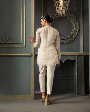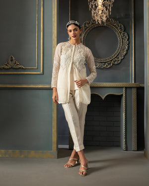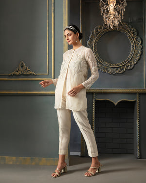 Classic to perfection our WHITE organza jacket paired with pure Chanderi pant is Must have in wardrobe pieces .Meticulously hand embroidered in silk resham,crystals and sequins.