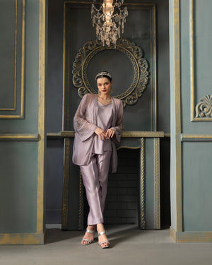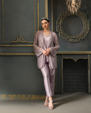 The the pure magic of classic reimagined with our front open organza jacket paired with slim pant of pure chanderi.Delightful handembroidery of stons and crystals enhances the style.
