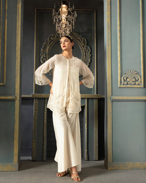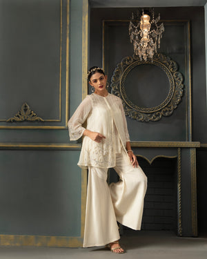 Undeniable elegance of our organza hand enbroiderd tunic paired with gharara pure chanderi pant.