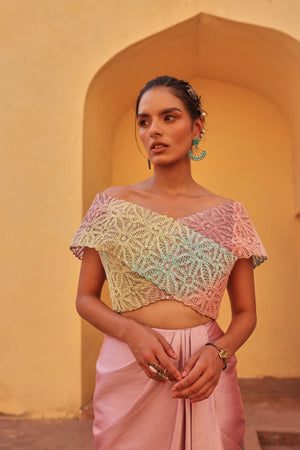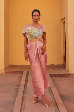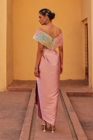 This stylish outfit features a uniquely draped skirt crafted from a fabric that subtly transitions between two tones. The off-shoulder structured top is made from a vibrant, multi-colored knitted fabric. This modern ensemble offers a blend of interesting textures and a sophisticated silhouette.